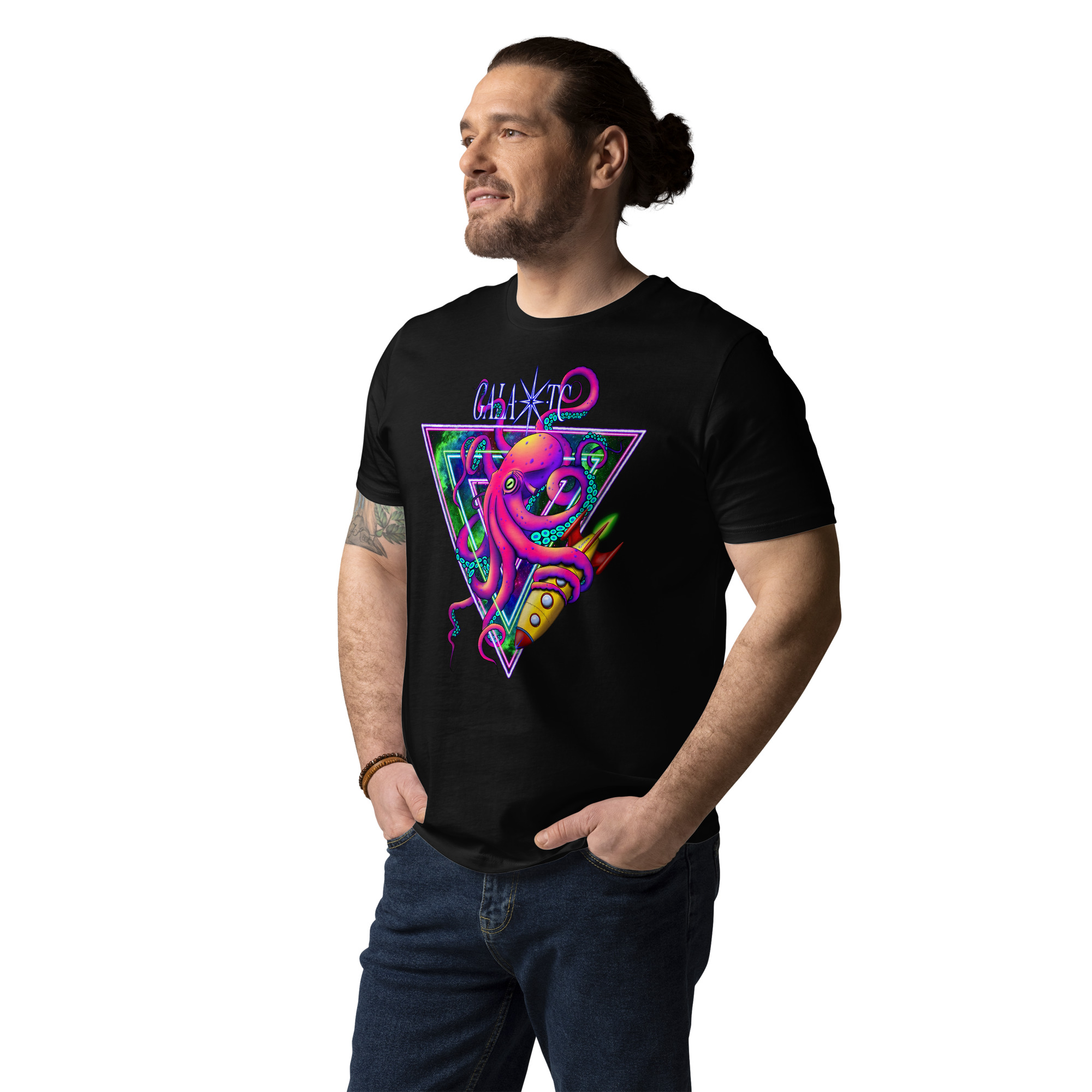 Een buitengewoon T-shirt dat de verbeelding prikkelt met zijn print van een octopus die gracieus door de ruimte zweeft, omringd door fonkelende sterren. Dit T-shirt is een absolute must-have voor avontuurlijke geesten die houden van de mysterie en pracht van de diepten van de oceaan en de grenzeloze kosmos.